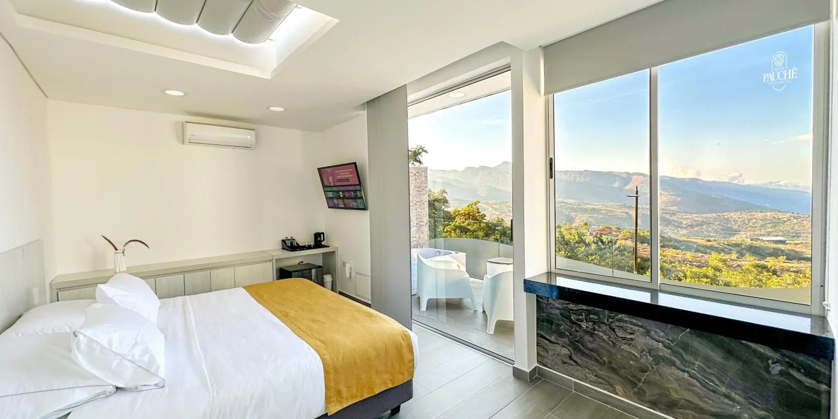 サパトカにあるHotel PAUCHÉ Topiario Zapatocaは無料WiFi付きのユニット、庭(屋外プール付)、サウナ、ホットタブを提供しており、山の景色が望めます。敷地内に専用駐車場があります。 タイルフロアのユニットには設備の整ったキッチン(冷蔵庫付)、薄型テレビ、専用バスルーム(シャワー、無料バスアメニティ付)が備わります。ミニバー、コーヒーメーカー、ポットも備わります。