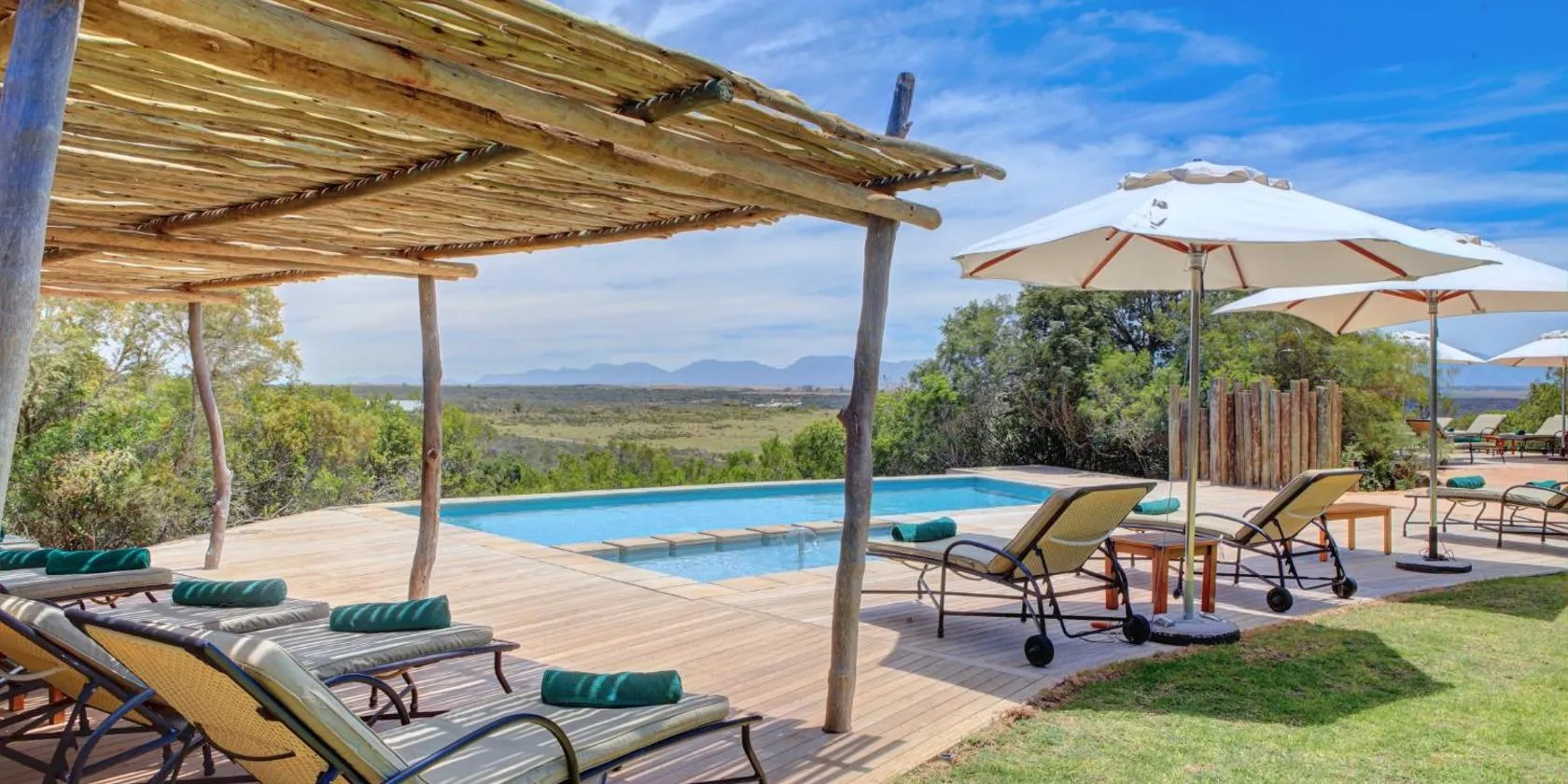 Garden Route Game Lodge is located near Albertinia, overlooking the Langeberg Mountain Range. It is surrounded by lush vegetation and various animals can often be seen.