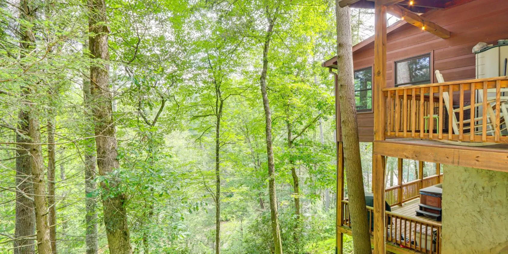 山の景色を望むAppalachian Cabin- Trout Stream Firepit Hot Tubはジョージア州のエリジェイにあり、バルコニーを提供しています。この宿泊施設では、テラス、無料専用駐車場、無料WiFiを提供しています。...