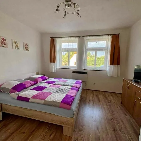 El Chaty U Tesařů es una casa de campo de madera totalmente equipada que ofrece una ubicación tranquila, una pista de voleibol y una terraza con zona de barbacoa.