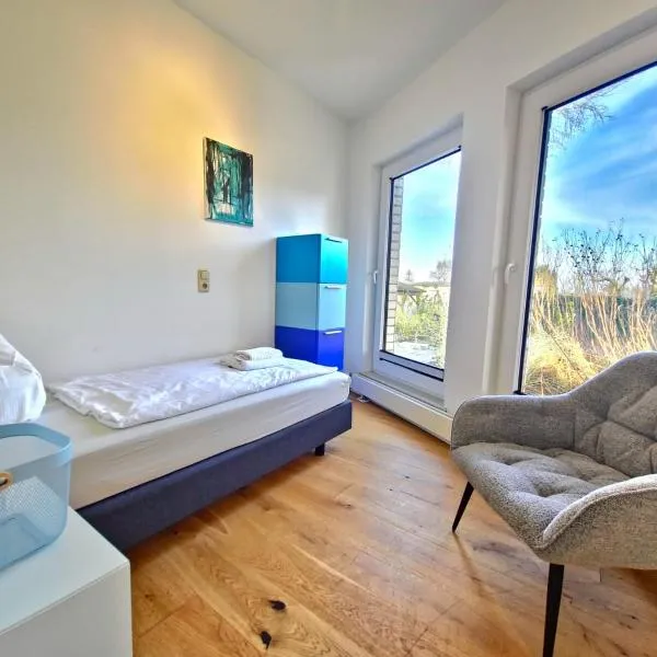 庭の景色を望むFischstuebchen NeebergはKrumminにある宿泊施設で、無料WiFiを提供しています。聖マリエン教会(グライフスヴァルト)から37kmの宿泊施設で、庭と無料専用駐車場を提供しています。 川の景色を望むテラス、ベッドルーム2室、リビングルーム、テレビ、設備の整ったキッチン(冷蔵庫、食器洗い機付)、バスルーム(シャワー付)1室が備わる別荘です。...
