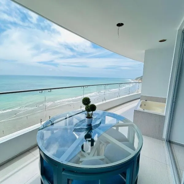 海の景色を望むTonsupa BeachはEsmeraldasのトンスパにあり、パティオを提供しています。トンスパビーチから徒歩6分の場所にあるエアコン付きの宿泊施設で、無料WiFiと敷地内の専用駐車場を提供しています。 市街の景色を望むバルコニーのあるアパートメントで、ベッドルーム2室、リビングルーム、衛星薄型テレビ、設備の整ったキッチン、バスルーム(シャワー、ホットタブ付)2室が備わります。