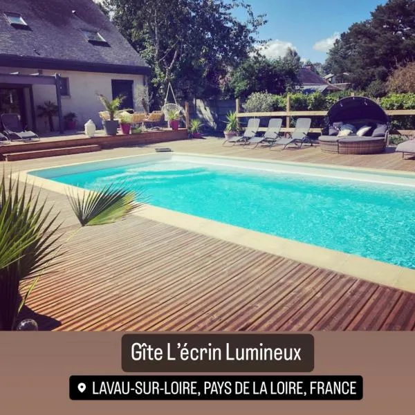 庭の景色を望むGîte à la campagneはポンシャトーにある宿泊施設で、サン・ナゼール駅から25km、ヘリテージ・ミュージアム・エコミュゼから28kmです。専用プールと無料専用駐車場を提供しています。 ベッドルーム3室、バスルーム1室、ベッドリネン、タオル、薄型テレビ、ダイニングエリア、設備の整ったキッチン、プールの景色を望むテラスが備わる別荘です。