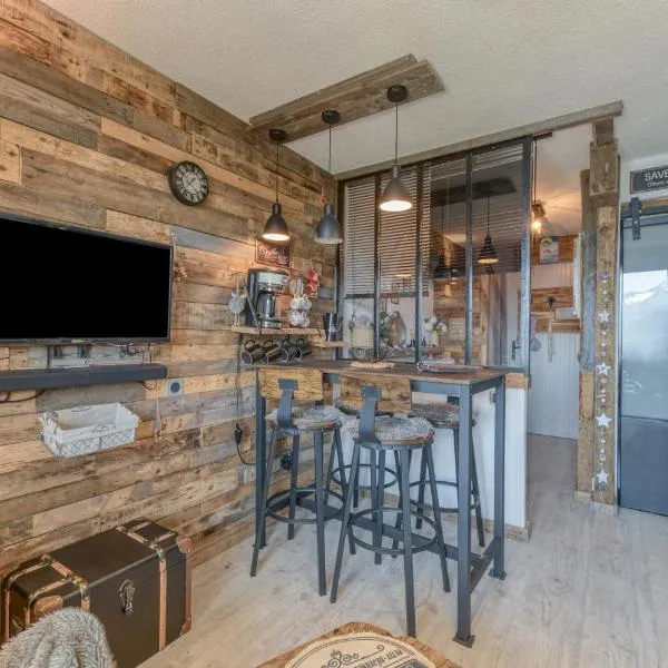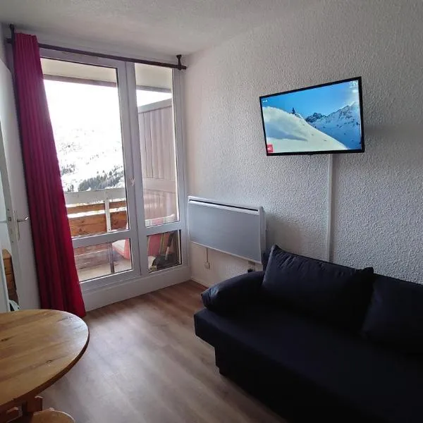 HuezにあるAppartement T2 avec coin montagne 6 couchagesは、バルコニーが備わるユニットを提供しています。館内全域での無料WiFiと敷地内の専用駐車場を提供しています。 山の景色を望むテラス、ベッドルーム1室、リビングルーム、薄型テレビ、設備の整ったキッチン(冷蔵庫、食器洗い機付)、バスルーム(シャワー付)1室が備わるアパートメントです。