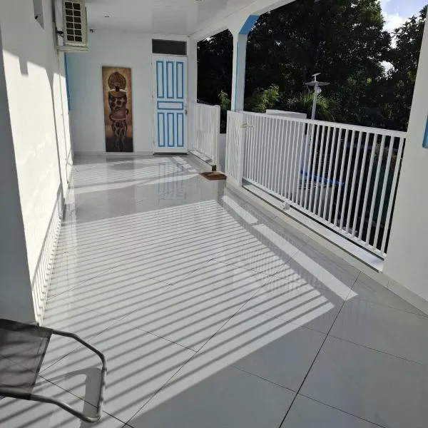 Petit-CanalにあるHaut de maison T4 à Petit Canalは、テラスを提供しています。この別荘には庭、無料専用駐車場があります。 庭の景色を望むバルコニーのあるエアコン付きの別荘で、ベッドルーム1室、設備の整ったキッチンがあります。薄型テレビが備わります。