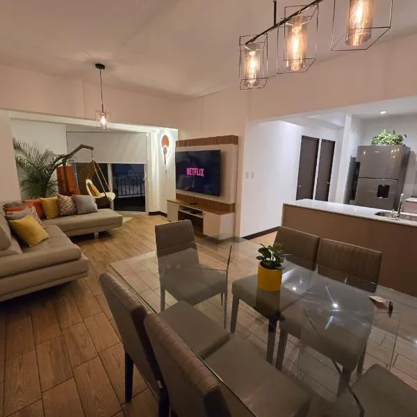 Quetzaltenango Central Parkから7kmのSkyview 13はケツァルテナンゴにある宿泊施設で、フィットネスセンター、無料WiFi、共用キッチン、24時間対応のフロントを提供しています。このアパートメントでは、無料専用駐車場とコンシェルジュサービスを提供しています。 テラス、ベッドルーム3室、リビングルーム、設備の整ったキッチンが備わるアパートメントです。