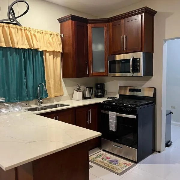 Cozy 2 bed in Ocho Riosはオーチョ・リオスにあります。サンセットビーチから徒歩18分の場所にある宿泊施設で、無料WiFiと敷地内の専用駐車場を提供しています。 ベッドルーム2室、リビングルーム、設備の整ったキッチン(冷蔵庫、ポット付)、バスルーム(シャワー付)3室が備わるエアコン付きの別荘です。薄型テレビが備わります。 イアン・フレミング国際空港まで13kmです。