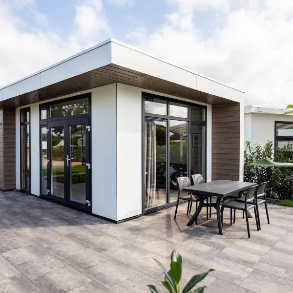 LUXUS Cube Ferienhaus Chalet am See mit Schwimmbad in Lathum NL, a property with a garden, is situated in Lathum, 14 km from Gelredome, 15 km from Burgers' Zoo, as well as 22 km from Hartenstein Park.