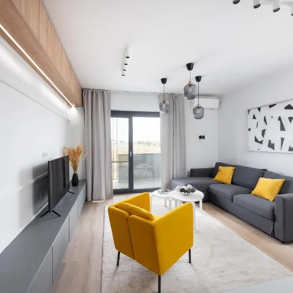 庭の景色を望むRelax in Style at Maurizia accommodation by Open Houseはティミシュ県のDumbrăviţaにあり、バルコニーを提供しています。このアパートメントでは、無料専用駐車場、24時間対応のフロント、無料WiFiを提供しています。...