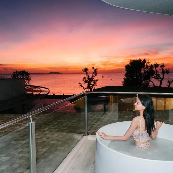 海の景色を望むThe Blu X Ocean view grand suite Top floorはテラスとバルコニーを提供する宿泊施設で、ウォンナファビーチまで約徒歩6分です。このアパートメントでは、パティオと無料WiFiが備わるユニットを提供しています。