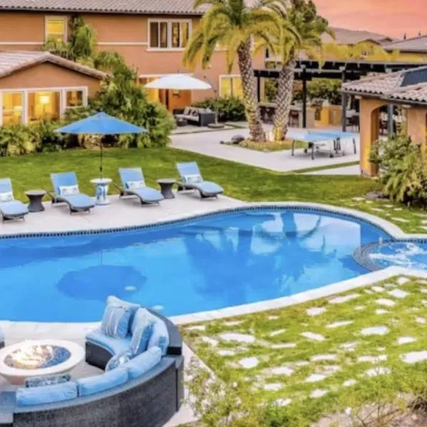 Sprawling Hilltop Retreat- Pool, Views, Sleeps 30! se encuentra en El Cajón y ofrece un balcón con vistas a la montaña y a la piscina, además de piscina al aire libre, centro de fitness y bañera de...