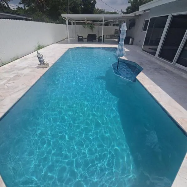 Heated Pool Tropical Backyard 3 Bedrooms, 12 min to the Oceanはノースマイアミビーチにあり、ハードロック・スタジアムまで8.6km、セミノール・ハードロック・ホテル&カジノまで15km、アドリアンヌ・アルシュト・センター・フォー・ザ・パフォーミング・アーツまで20kmです。敷地内に専用駐車場があります。