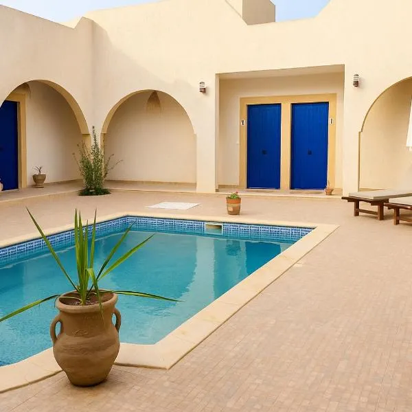 メズライアにあるMaison d'hôtes Dar El Kahina Djerbaは庭、共用ラウンジ、サンテラス(プール付)、ビュッフェ朝食を提供しています。このゲストハウスは無料WiFiを提供しており、メズライア・ビーチまで約徒歩6分、ジェルバ・ゴルフクラブまで約4.7kmです。無料専用駐車場と有料空港シャトルサービスを提供しています。