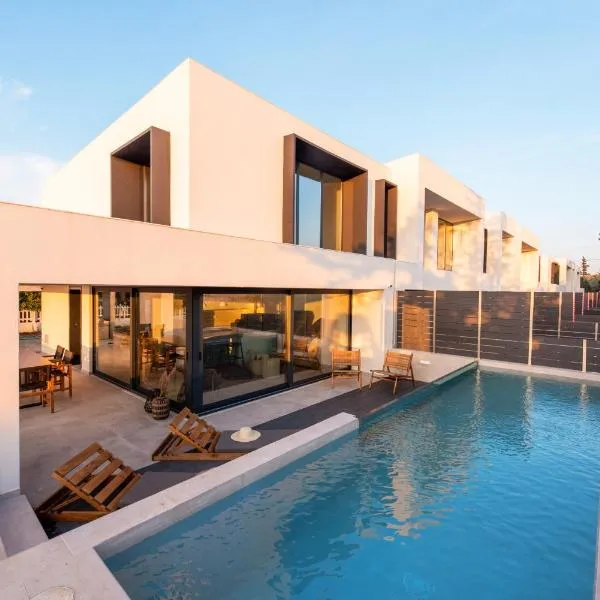 市街の景色を望むSerene villas halkidiki - Superiorはテラスとバルコニーを提供する宿泊施設で、サハラビーチまで約徒歩数分です。この別荘では、専用プール、庭、バーベキュー施設、無料WiFi、無料専用駐車場を提供しています。
