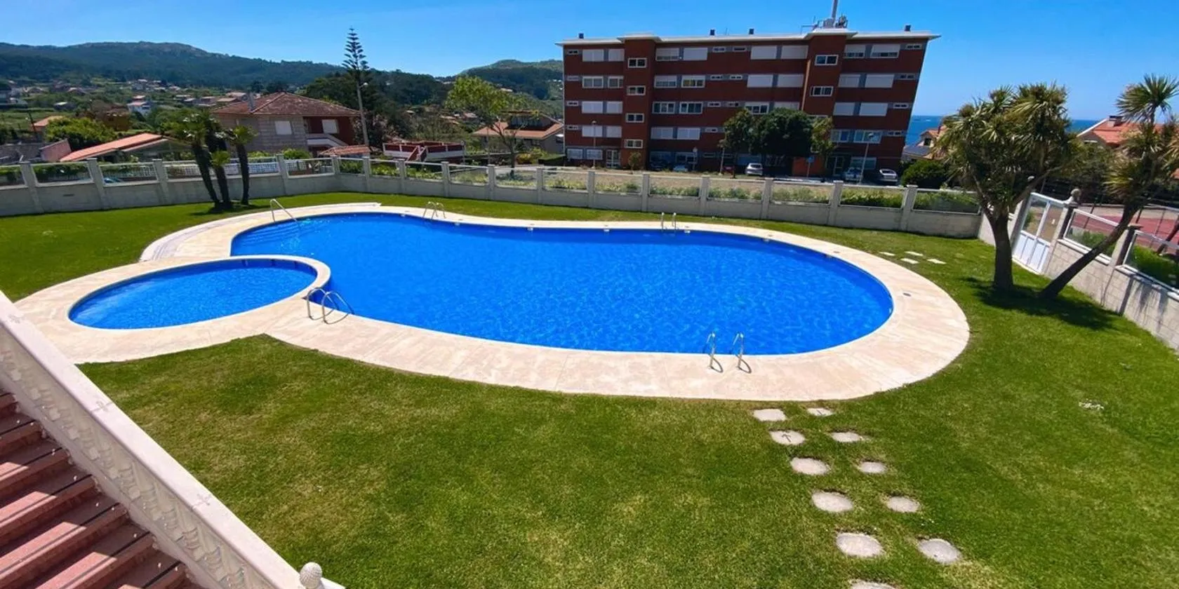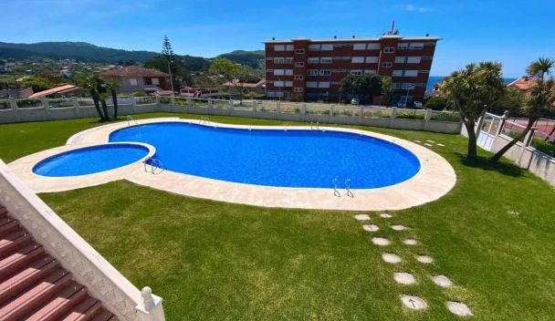 Holibai Albatros, Dúplex al ladito del Mar, con terrazas y piscina, Baiona, que cuenta con piscina al aire libre y jardín, dispone de alojamiento en Baredo con wifi gratis y vistas a la montaña.