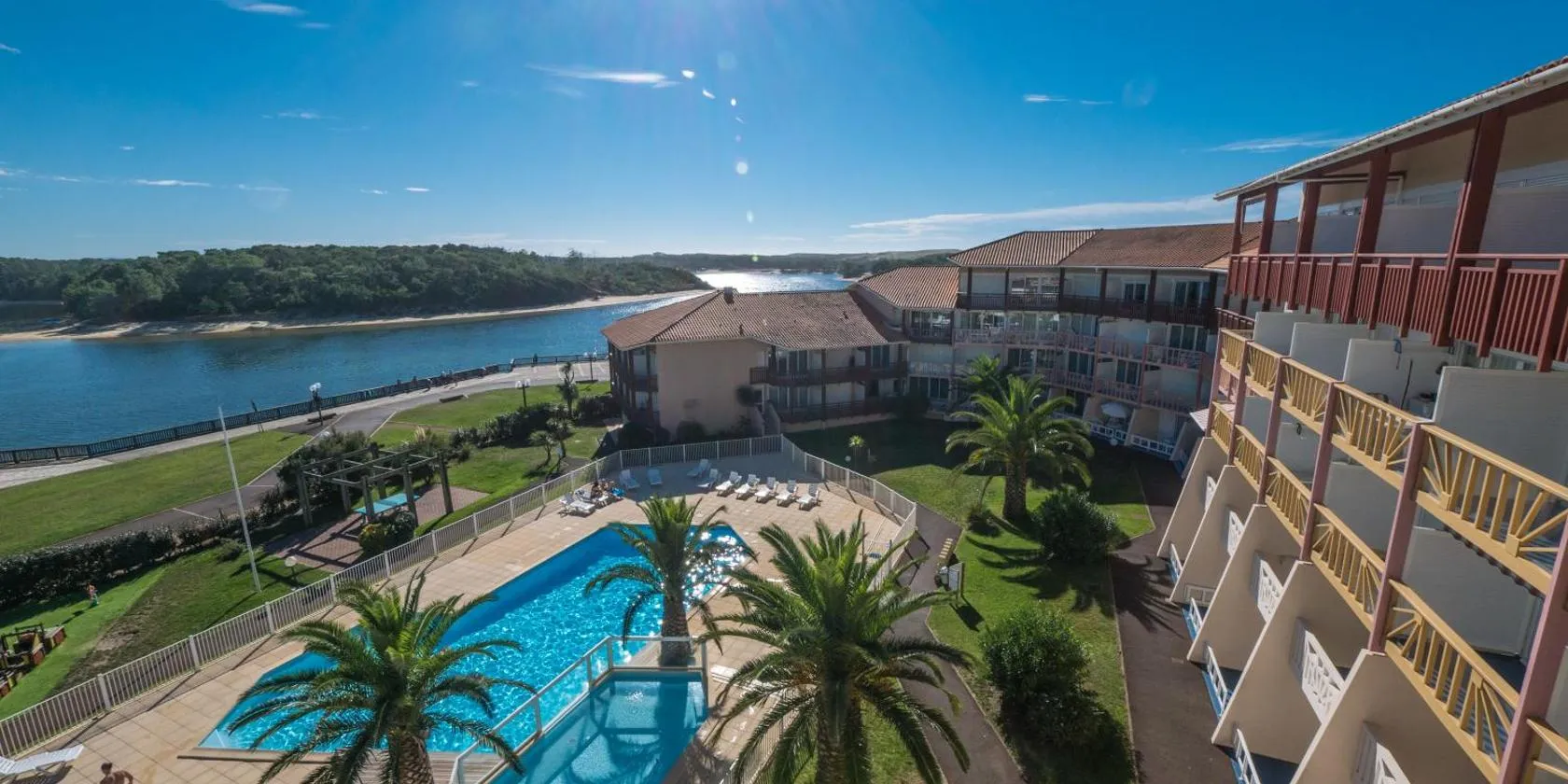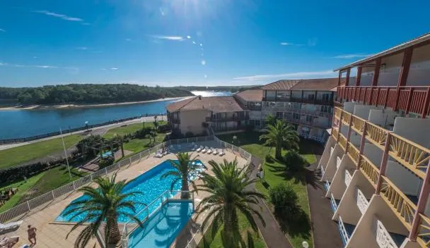 V-Landes 01-Vieux Boucau Appartement dans résidence avec piscine au bord du lac marin es un alojamiento con piscina de temporada al aire libre y zona de playa privada que está en Vieux-Boucau-les-...