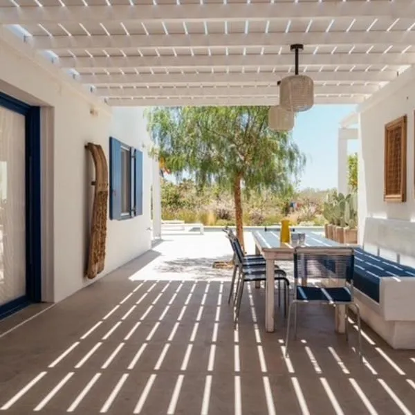 ゴールデンビーチから徒歩数分のNuovo Paros-Property of 2 sustainable luxury beach villasは、季節限定の屋外プール、庭、エアコン付きのユニット(パティオ付)、無料WiFiを提供しています。敷地内に専用駐車場があります。
